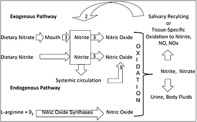 Figure 2 : Diagramme schématique de la disposition physiologique des nitrates, des nitrites et de l'oxyde nitrique de sources exogènes (alimentaires) et endogènes.